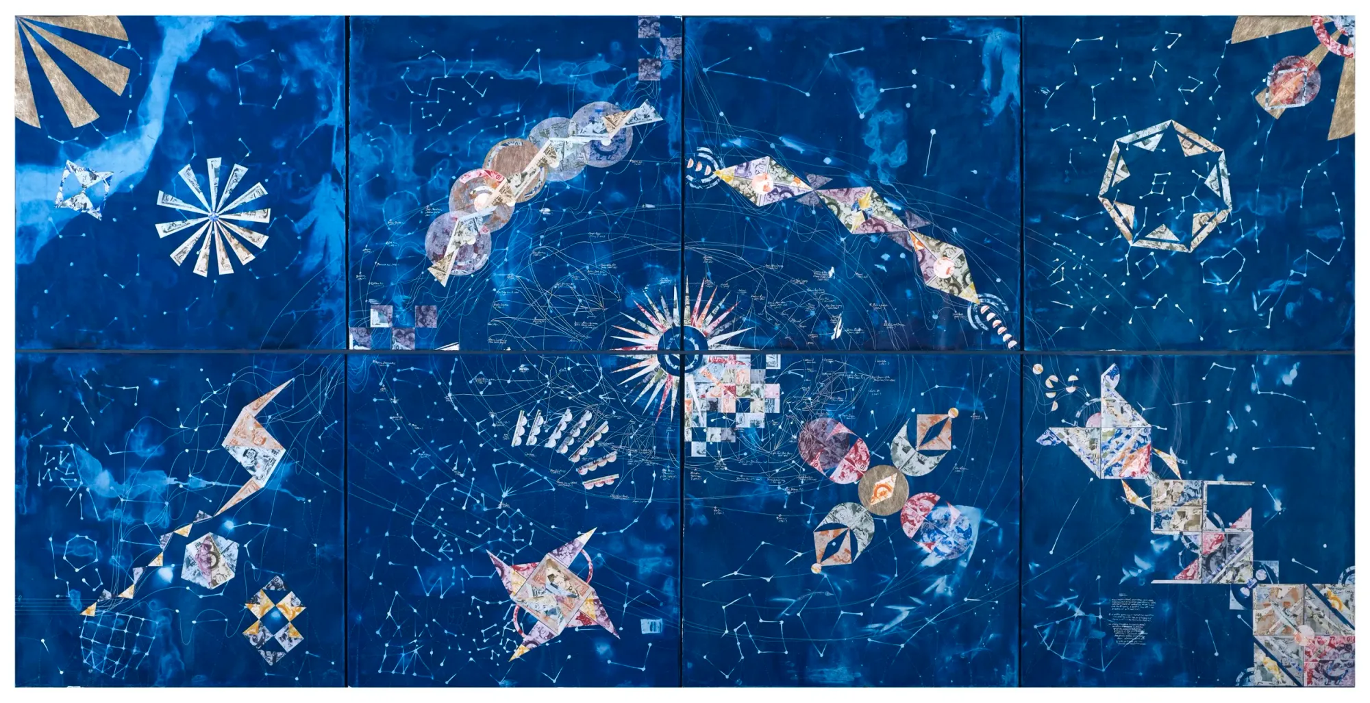 Where the exhibition sometimes slips is when its drive for a multiplicity of ideas and forms tips into morass, where density obscures rather than deepen critique.In the commanding centre is Connie Zheng’s 4.6-metre As It Is: Nothing Lasts Forever (2025), which charts centuries of commodity capitalism as a cosmic map. Intaglio cuts of banknotes float like stars; myriad corporate lifelines form a constellation in an indigo sky. From a distance, the wall twinkles like a Bloomberg terminal as re-imagined by an astrologer; up close, the density of nodes dilutes the web of Empire until its threads seem equivalent, flattening the asymmetries of extraction it wants to illuminate. Mapping complexity is not, it turns out, the same as interrogating it. Awe elbows out introspection. A similar tension shadows the surfeit of video works elsewhere in the show: Khvay Samnang’s haunting Rubber Man (2014) where the artist, naked, stomps about rubber plantations, his body sluiced in raw latex, remains viscerally compelling, but in a forest of glowing screens its ecological lament feels unmoored.